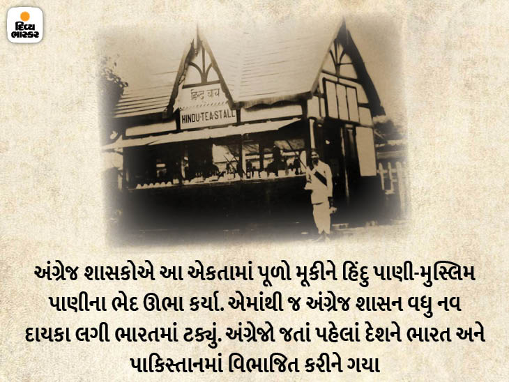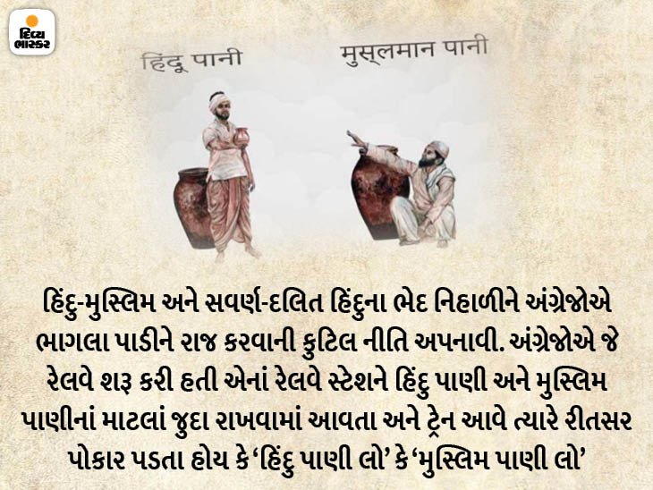 અંગ્રેજ શાસનની એ જ કુટિલ ચાલોમાં અટવાઈને રેલવે સ્ટેશનોએ હિંદુ અને મુસ્લિમ બેઉ કોમ માટે અલગ અલગ પાણીની વ્યવસ્થા નિર્માણ થઈ. હમણાં અસગર વજાહતના પુસ્તક 'હિંદુ પાની, મુસ્લિમ પાની'માં તેમણે એ જમાનાને યાદ કરીને સ્પષ્ટ લખ્યું કે કોઈ ધર્મ પ્રત્યેની નિષ્ઠા હોવી અને કોમવાદી હોવું એ બંને વચ્ચે અંતર છે. આપણે ત્યાં આજકાલ બધું સેળભેળ થઇ રહ્યું છે. દલિતોને સ્પર્શતાં અભડાઈ જવાય કે તેમને મંદિર કે રેસ્ટોરાંમાં પ્રવેશ ન આપી શકાય એવા યુગમાં જીવતા ભારતીય હિંદુઓ સમયાંતરે કહેવાતી ‘નીચલી’ કે ‘અભડાઈ જવાય’ એવી કહેવાતી જ્ઞાતિઓના લોકો સાથે પશુ કરતાં પણ ભૂંડો વ્યવહાર કરતા રહ્યા. સ્વાભાવિક રીતે મુસ્લિમ શાસકો કે ખ્રિસ્તી શાસકોના પ્રતાપે એમાંના ઘણા બધા મુસ્લિમ કે ખ્રિસ્તી થયા. રાજા-મહારાજા કે શિક્ષિત ઉચ્ચવર્ણીય બ્રાહ્મણો પણ મુસ્લિમ કે ખ્રિસ્તી થયા હતા એ રખે ભૂલીએ. મહારાણા પ્રતાપ કે છત્રપતિ શિવાજી મહારાજના શાસનમાં એમના કેટલાક વિશ્વાસુ સરદારો કે દરબારી મુસ્લિમ હતા. દાહોદમાં જન્મેલા બાદશાહ ઔરંગઝેબ જેવા ધર્મઝનૂની મનાતા મુઘલ બાદશાહના શાસનકાળમાં પણ એના વિશાળ સામ્રાજ્યની માત્ર 8% વસ્તી જ મુસ્લિમ હતી. એના દરબારીઓ કે સરસેનાપતિ સહિતના અધિકારીઓમાં બાદશાહ અકબર જેવા સર્વધર્મનો આદર કરનારા એના પૂર્વજના શાસનકાળ કરતાં પણ વધુ હિંદુ હતા એ ઐતિહાસિક હકીકતને નકારવાનું શક્ય નથી. હિંદુ-મુસ્લિમ અને સવર્ણ-દલિત હિંદુના ભેદ નિહાળીને અંગ્રેજોએ ભાગલા પાડીને રાજ કરવાની કુટિલ નીતિ અપનાવીને એ ખાઈને વધુ પહોળી કર્યા કરી. એટલી હદ સુધી કે અંગ્રેજોએ પોતાનાં સ્વાર્થ ખાતર જે રેલવે શરૂ કરી હતી એનાં રેલવે સ્ટેશને છેક આઝાદી સુધી હિંદુ પાણી અને મુસ્લિમ પાણીનાં માટલાં કે કુંજા જુદા રાખવામાં આવતાં અને સ્ટેશને ગાડી આવે ત્યારે રીતસર પોકાર પડતા હોય કે 'હિંદુ પાણી લો' કે 'મુસ્લિમ પાણી લો'. એવું જ હિંદુ ચા અને મુસ્લિમ ચાના નોખા સ્ટોલનું હતું. દલિતોને હોટેલમાં ચા પીવા કે નાસ્તો કરવા કે જમવા જવા માટે પણ પ્રતિબંધ વહોરવો પડતો. બનાવટી નામે પ્રવેશ કર્યા પછી જો પકડાયા તો માર ખાવાનો વારો આવતો. મહારાજા સયાજીરાવ ગાયકવાડ તૃતીયની શિષ્યવૃત્તિથી વિદેશ ભણીને આવેલા અને મહારાજાએ પોતાના મિલિટરી સેક્રેટરી નિયુક્ત કરેલા ડૉ. આંબેડકર સાથે પણ વડોદરામાં કેવો વ્યવહાર થયો હતો એ સુવિદિત છે.
